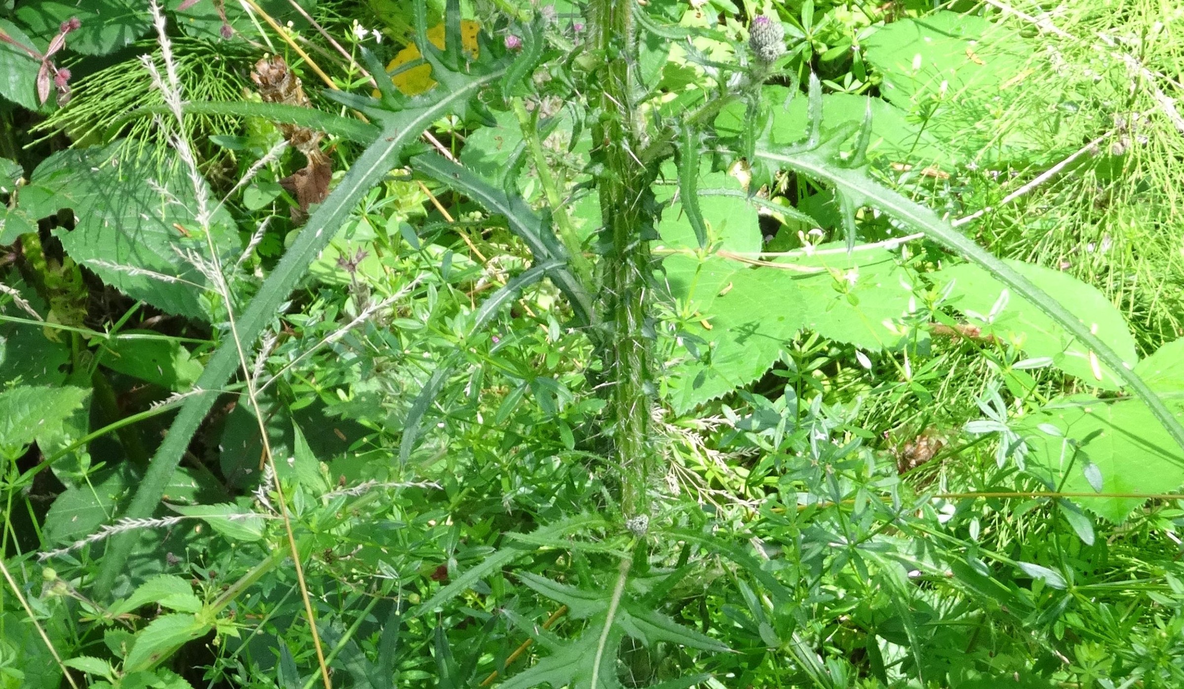 Hier möchte ich euch eine seltsame Distel vorstellen, die ich für eine Lanzett-Distel (Cirsium vulgare) halte. Aber eine Lanzett-Distel mit solch langen dolchähnlichen Blättern habe ich noch nie gesehen. Liegt dies noch in der Normalverteilung oder kann es es sich um eine Hybride mit einer anderen Art handeln?