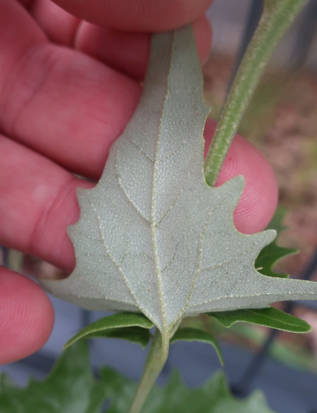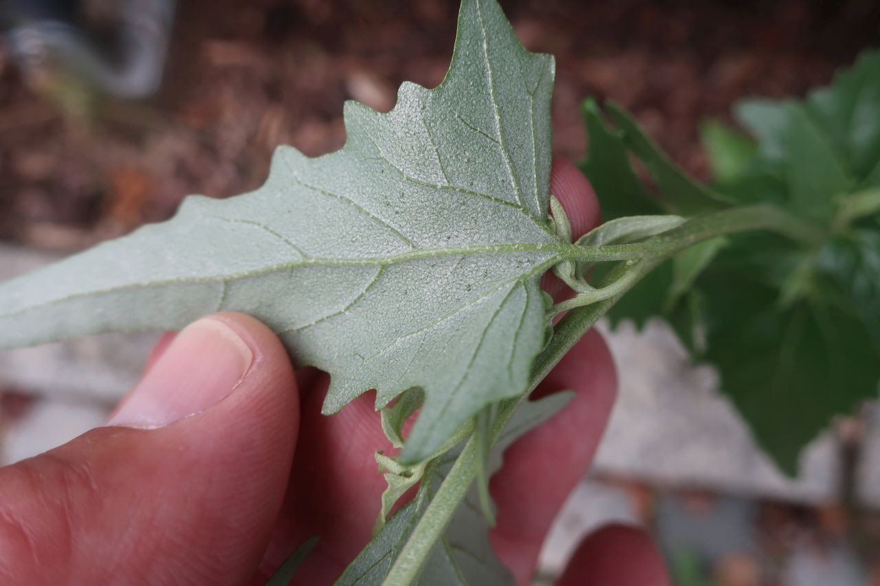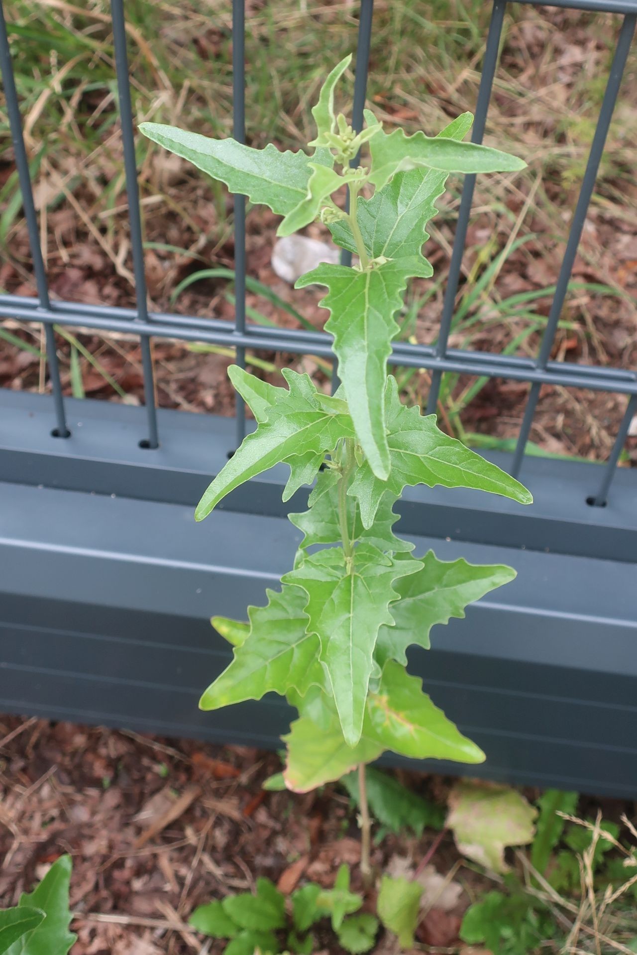 Ich bin mir inzwischen recht sicher, dass wir es hier mit A. sagittata zu tun haben, denn heute habe ich ein Vergleichsexemplar gefunden: Fahrbahnteiler an einer Ausfallstraße in Hallstadt nördlich von Bamberg, ebenfalls ohne Blüten/Früchte. Die Blätter weniger stark eingebuchtet, oberseits matter glänzend als die Hofer Exemplare, unterseits nicht so weiß bemehlt, sondern, wie Thomas es genannt hat "weiß schülfrig", und mit gutem Willen kann man auch einen roten Striemen am Blattansatz erkennen.