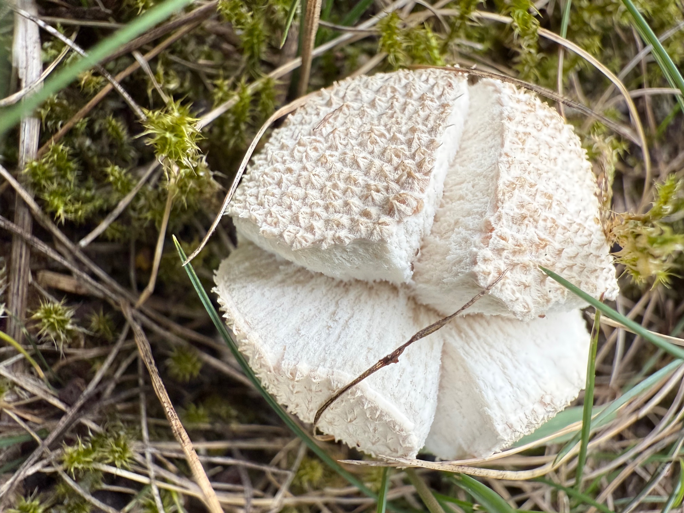 Der ist eigentlich noch ziemlich jung, d.h. innen weiẞ (wenn auch nicht mehr sehr fest). Man sieht noch sehr ausgeprägte Stacheln, die aber sehr leicht abfallen und auf der Oberfläche keine Netzspuren hinterlassen. Deshalb findet man im Web (und in der Natur) oft viel glattere Exemplare, die noch nicht geöffnet sind.