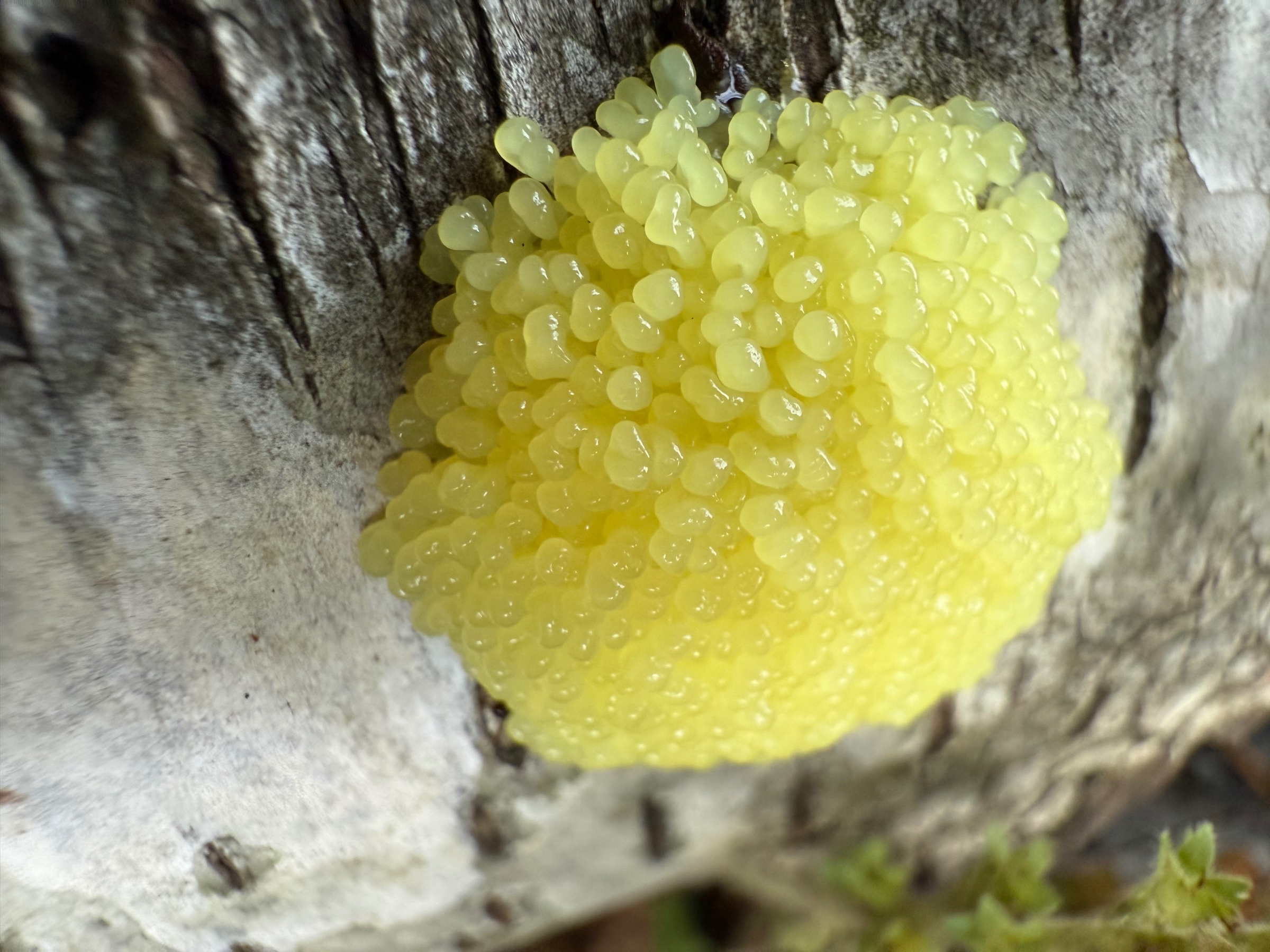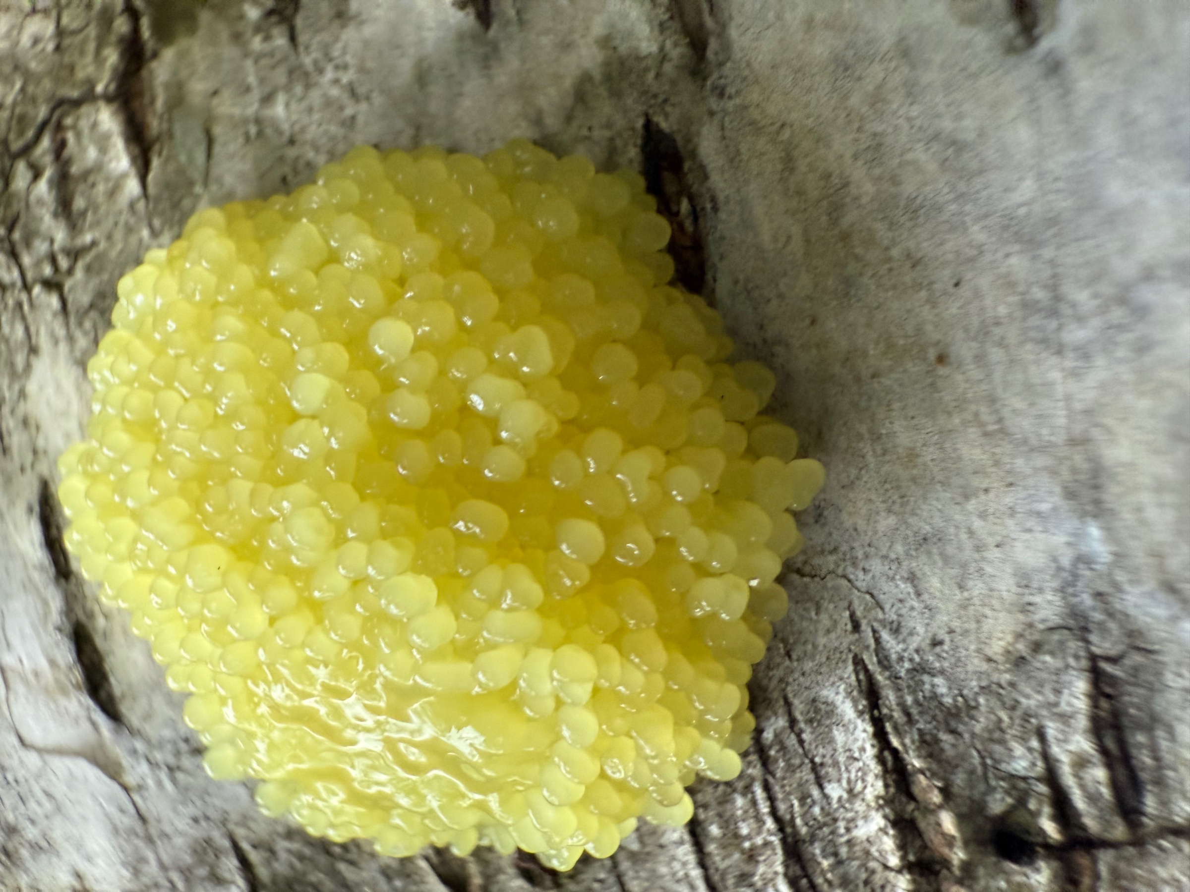 Formal ähnelt das dem Fischeier-Schleimpilz Tubifera ferruginosa (Tubulifera arachnoidea), aber die gelbe Farbe passt nicht - der wäre in dem Stadium lachsrosa. (Es gibt im Netz, bei Flickr o.ä., auch gelbe "Kugelhaufen", die so beschriftet sind ... nach dem Motto "was soll es schon anders sein" - aber das ist mit großer Wahrscheinlichkeit nicht richtig).
