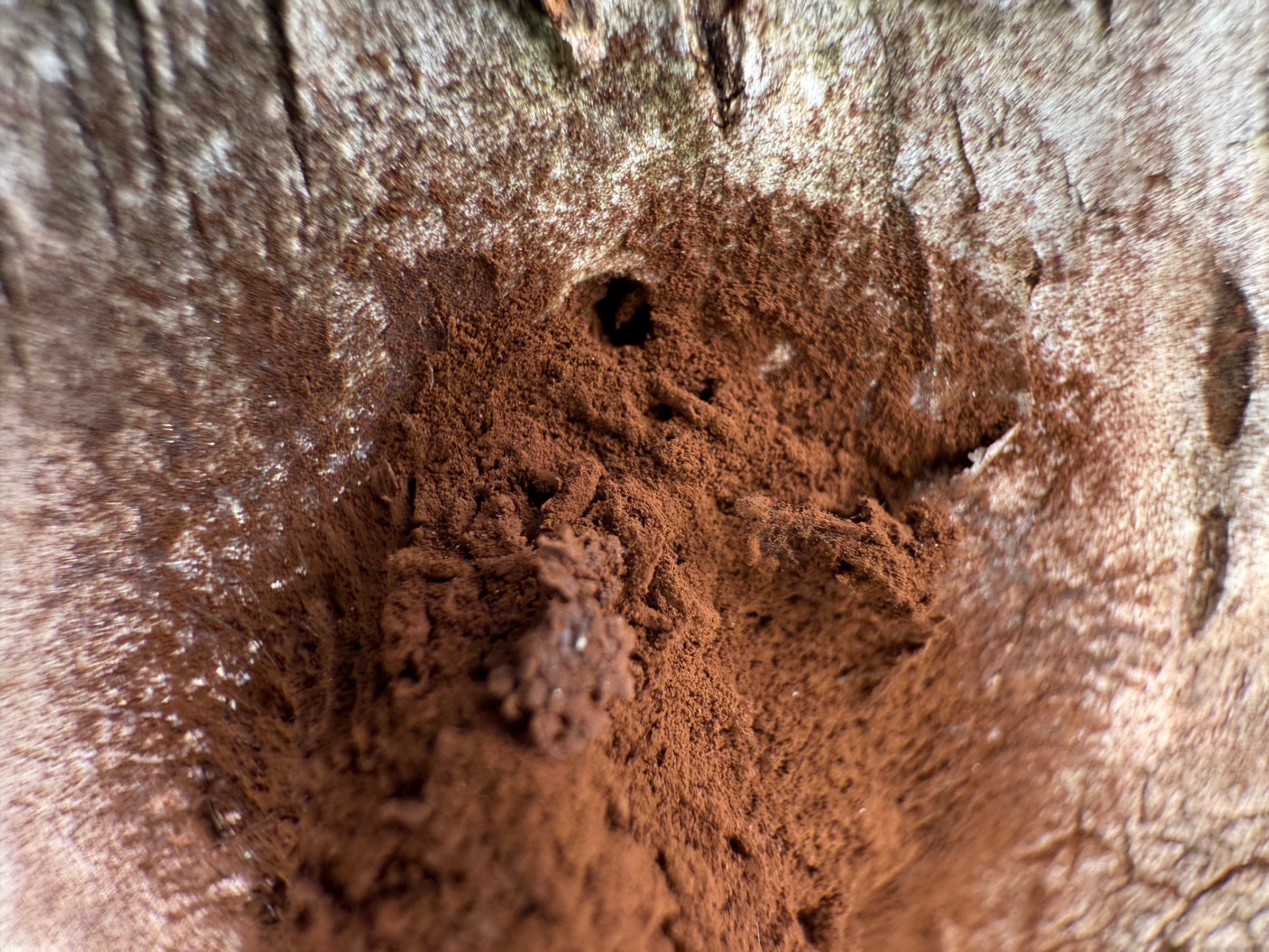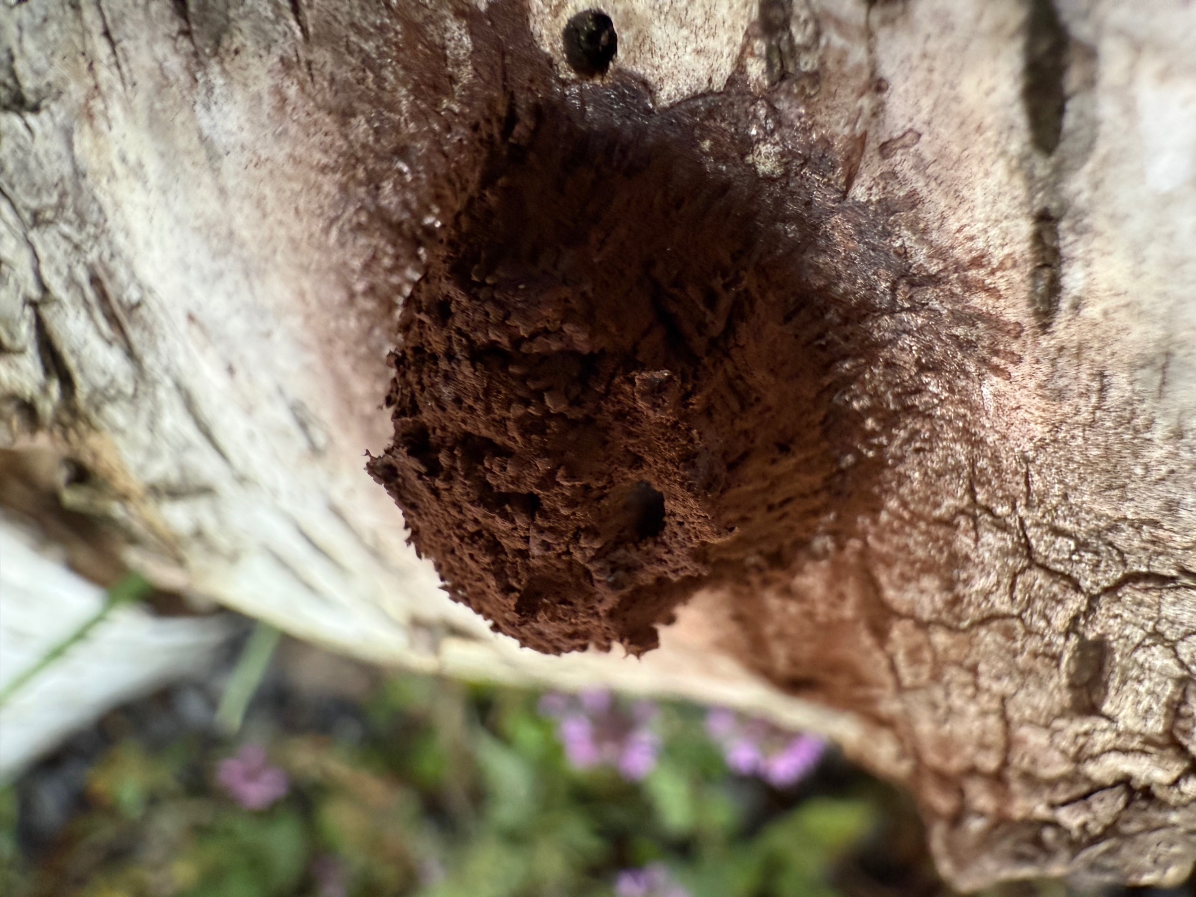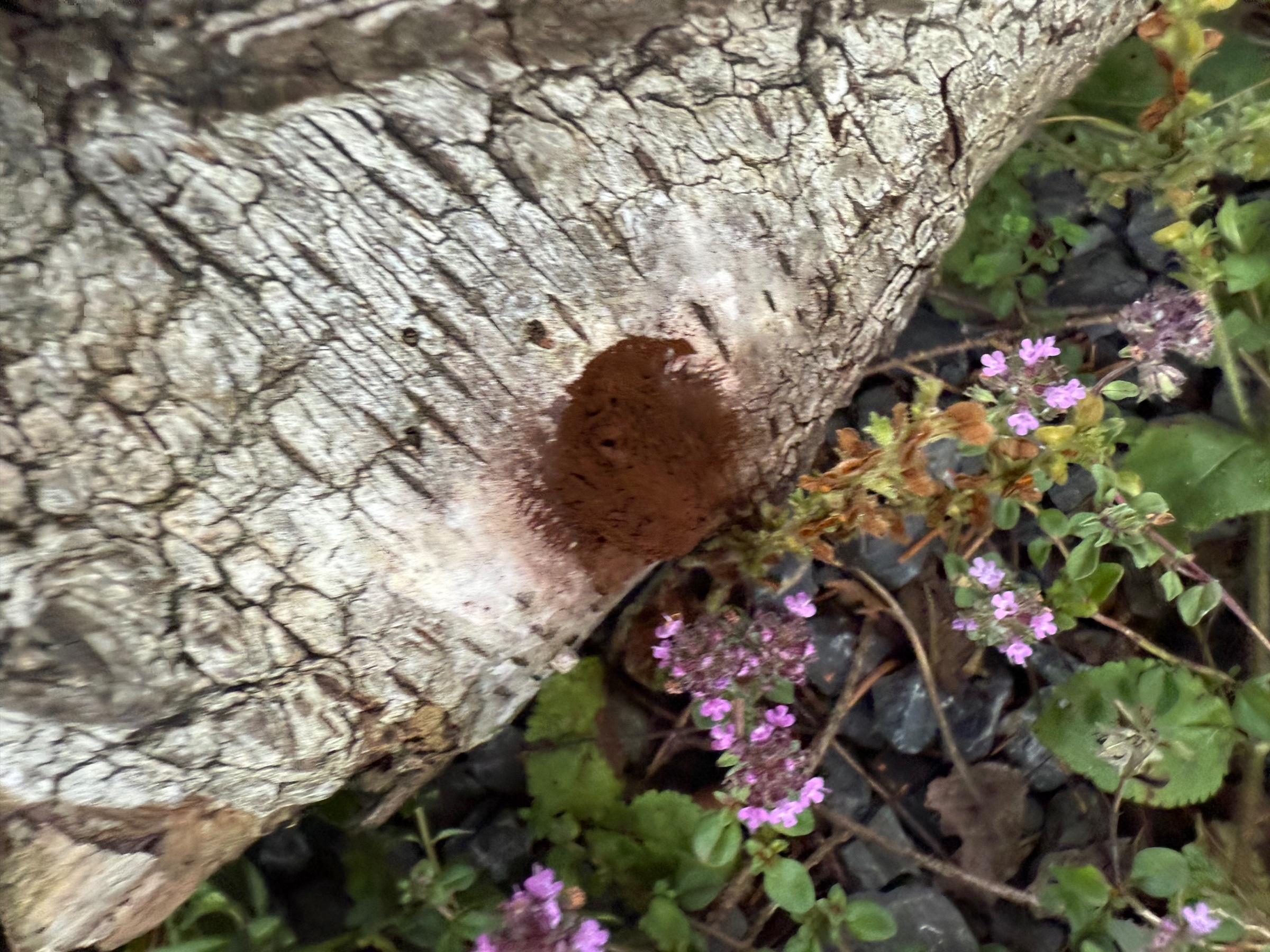 Fundort auf Birkenstamm in beetumrandung unter Fichte