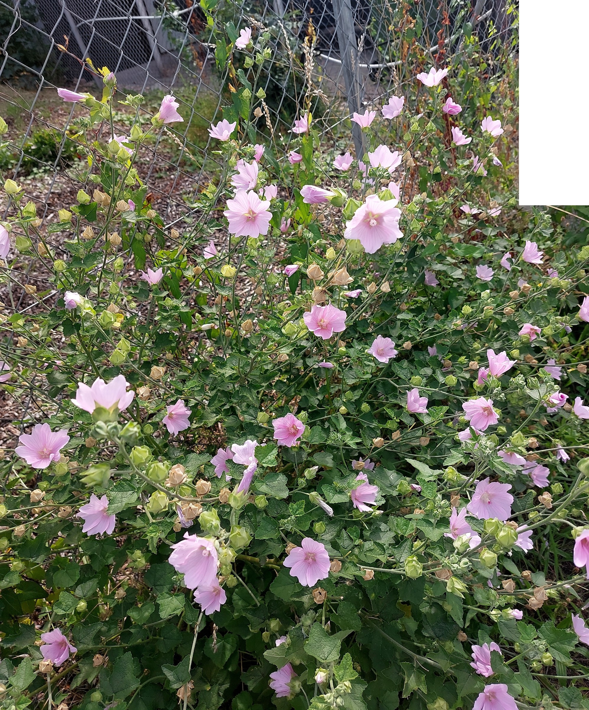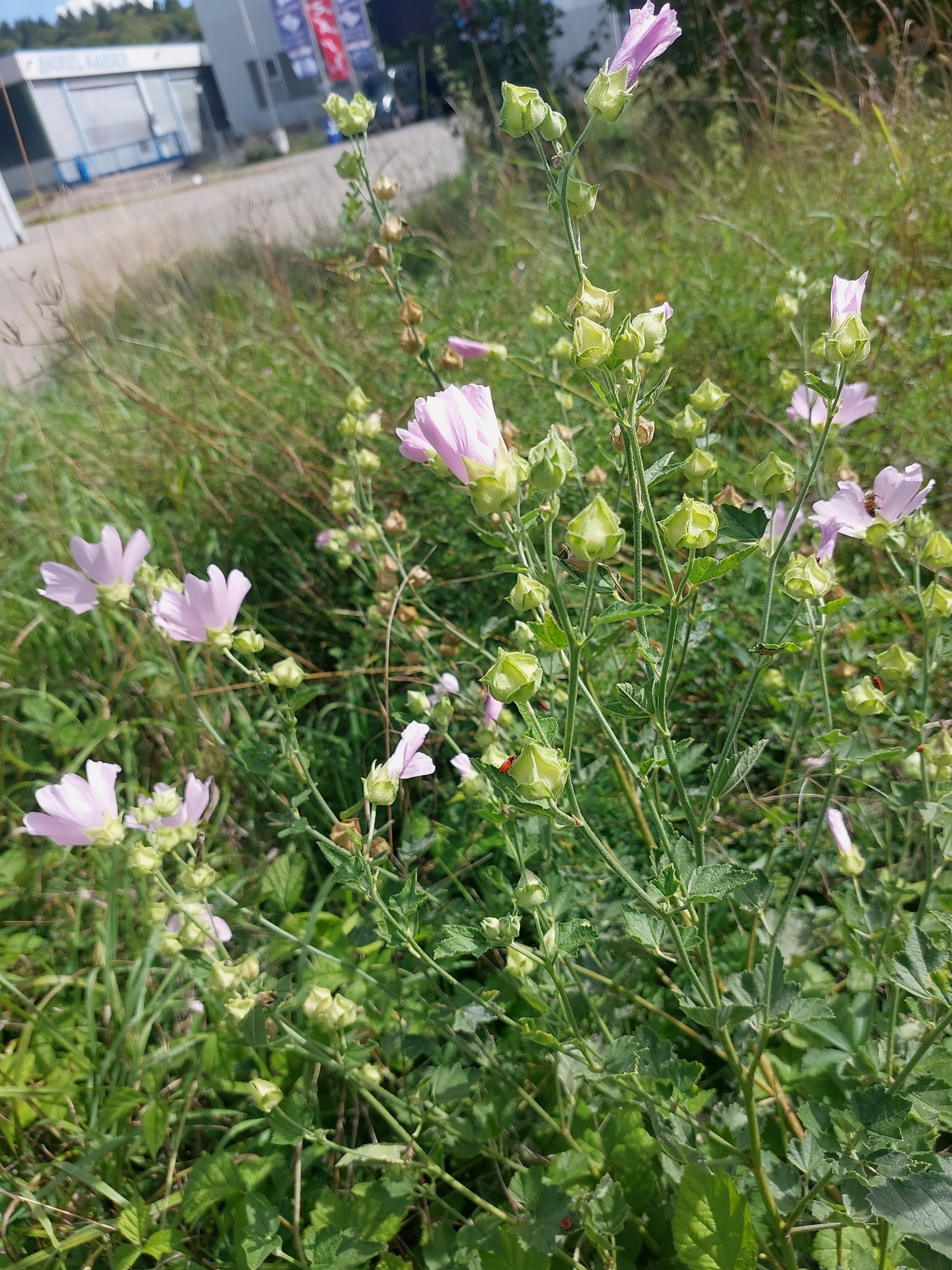 Malva thuringiaca, heute in einem Gewerbegebiet in Bretten aufgenommen: Die Blätter sind nur grob gelappt und die drei Außenkelchblätter sehr breit und am Grund verwachsen.