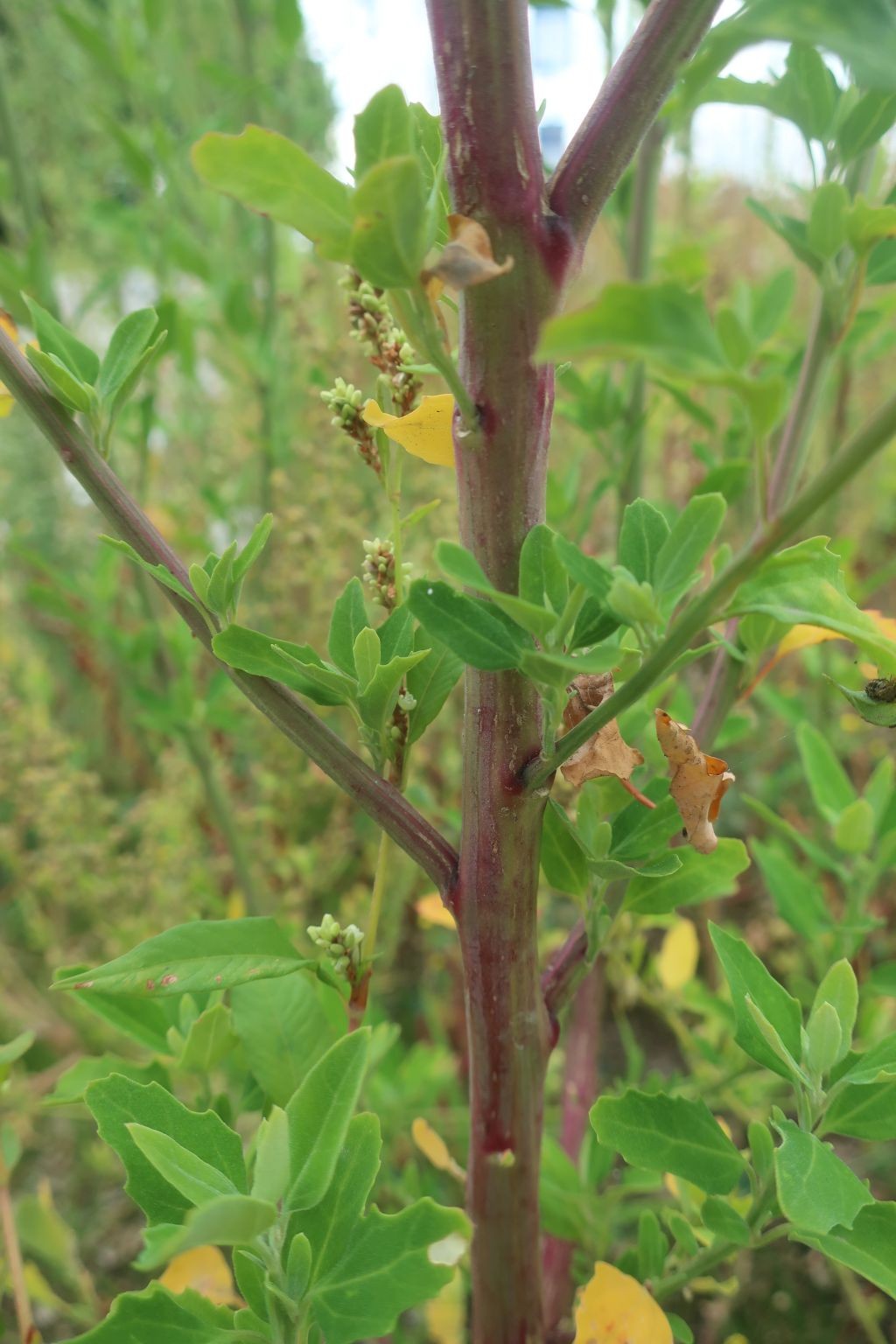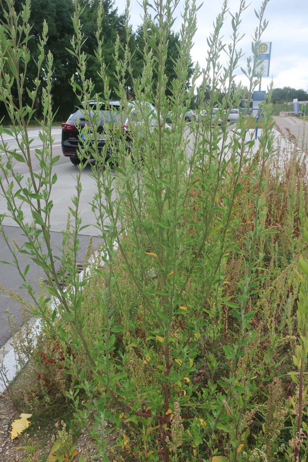 am Uniklinikum Augsburg entsteht ein neuer Medizin-Campus, das ist aktuell die größte Baustelle in der Umgebung. Heute habe ich da mal vorbeigeschaut. Bei einer neu angelegten Bushaltestelle gibt es schöne Flächen mit diversen Ruderalarten. Unter zahlreichem Chenopodium album ist mir dieses Exemplar aufgefallen, das sich deutlich von den anderen unterschieden hat: von Grund auf verzweigt, Äste bogig aufsteigend, zu den endständigen sehr viele blattachselständige Blüten, Stängel rot gestreift bzw. rot überlaufen. Ist das Chenopodium strictum oder doch nur eine der vielen Erscheinungsformen von Chenopodium album?