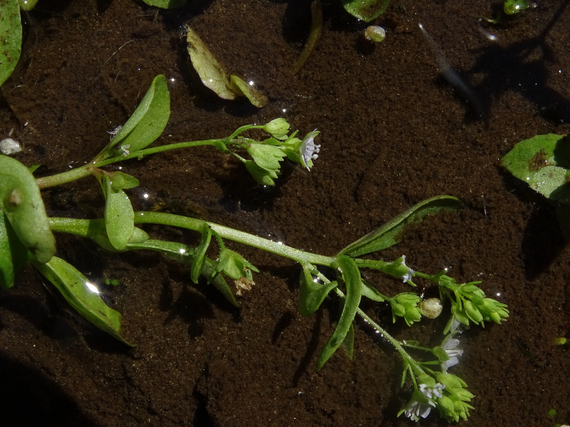 In einem Quellmoor, auf der Wasseroberfläche flutende, kleine Pflanze. Krone weiß.