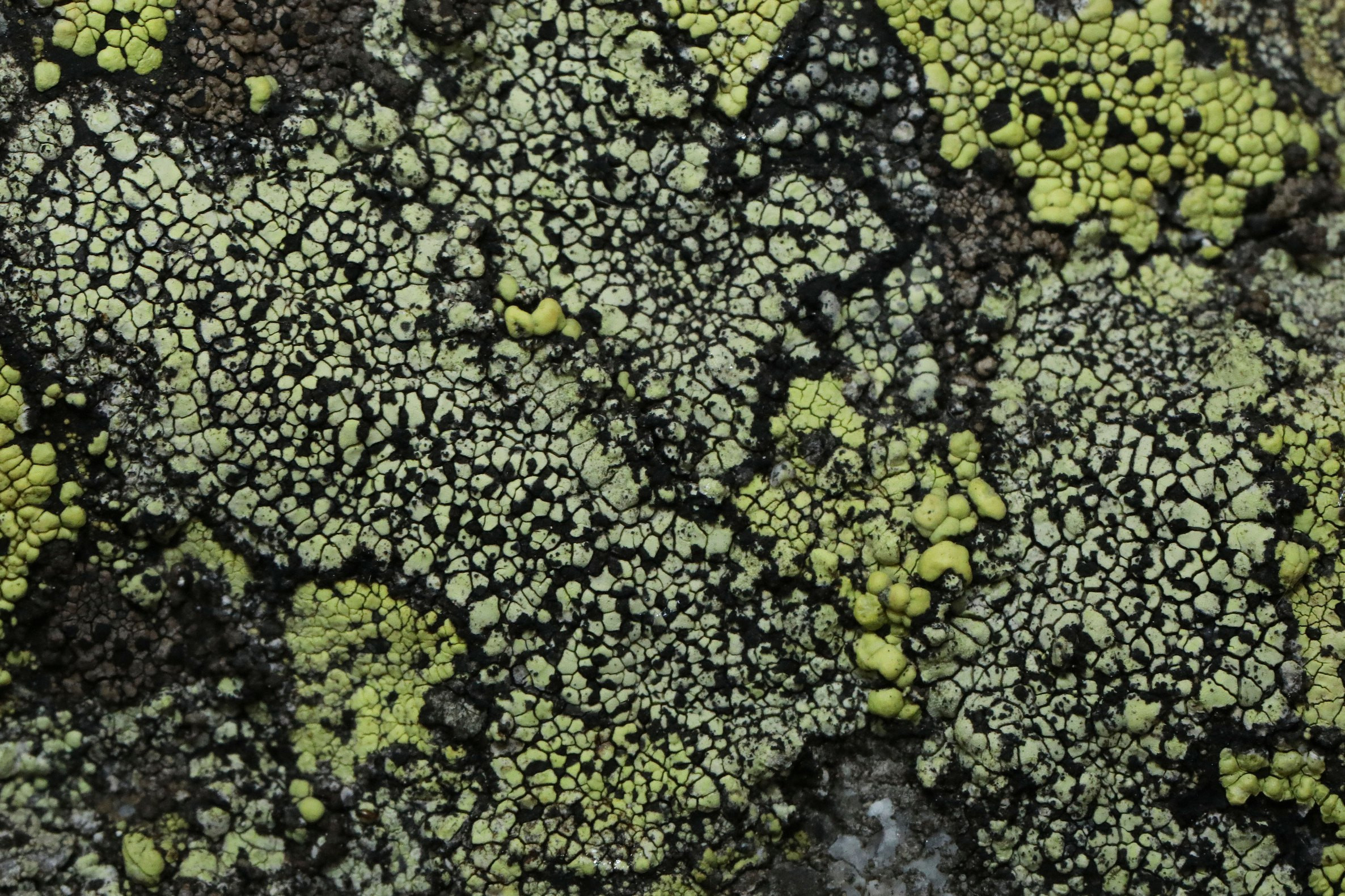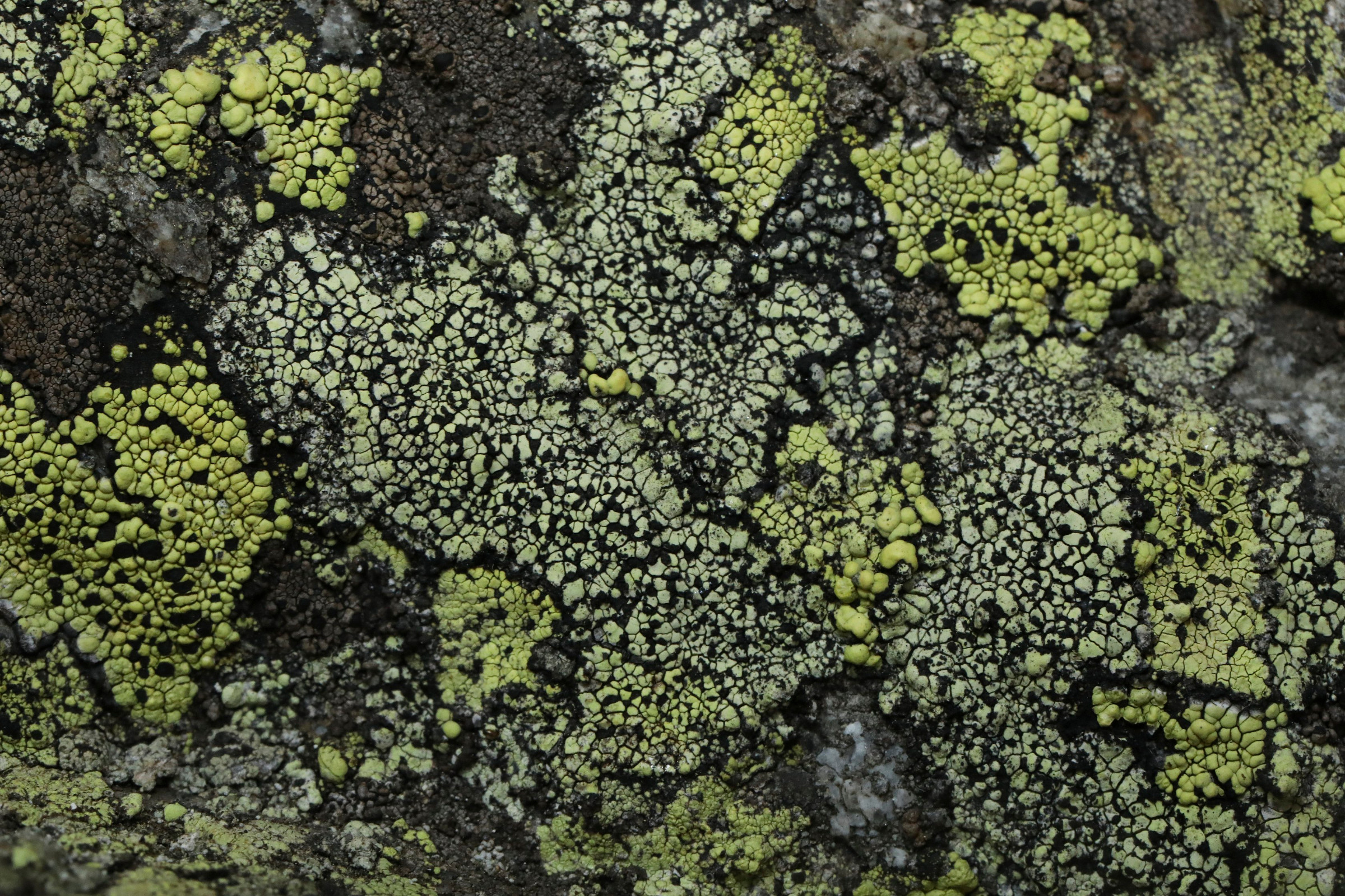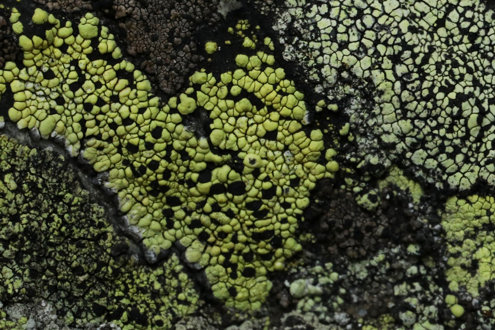 Die goldgelbegrünliche Flechte ist sicherlich die Rhizocarpon geographicum, die gewöhnliche Landkartenflechte.