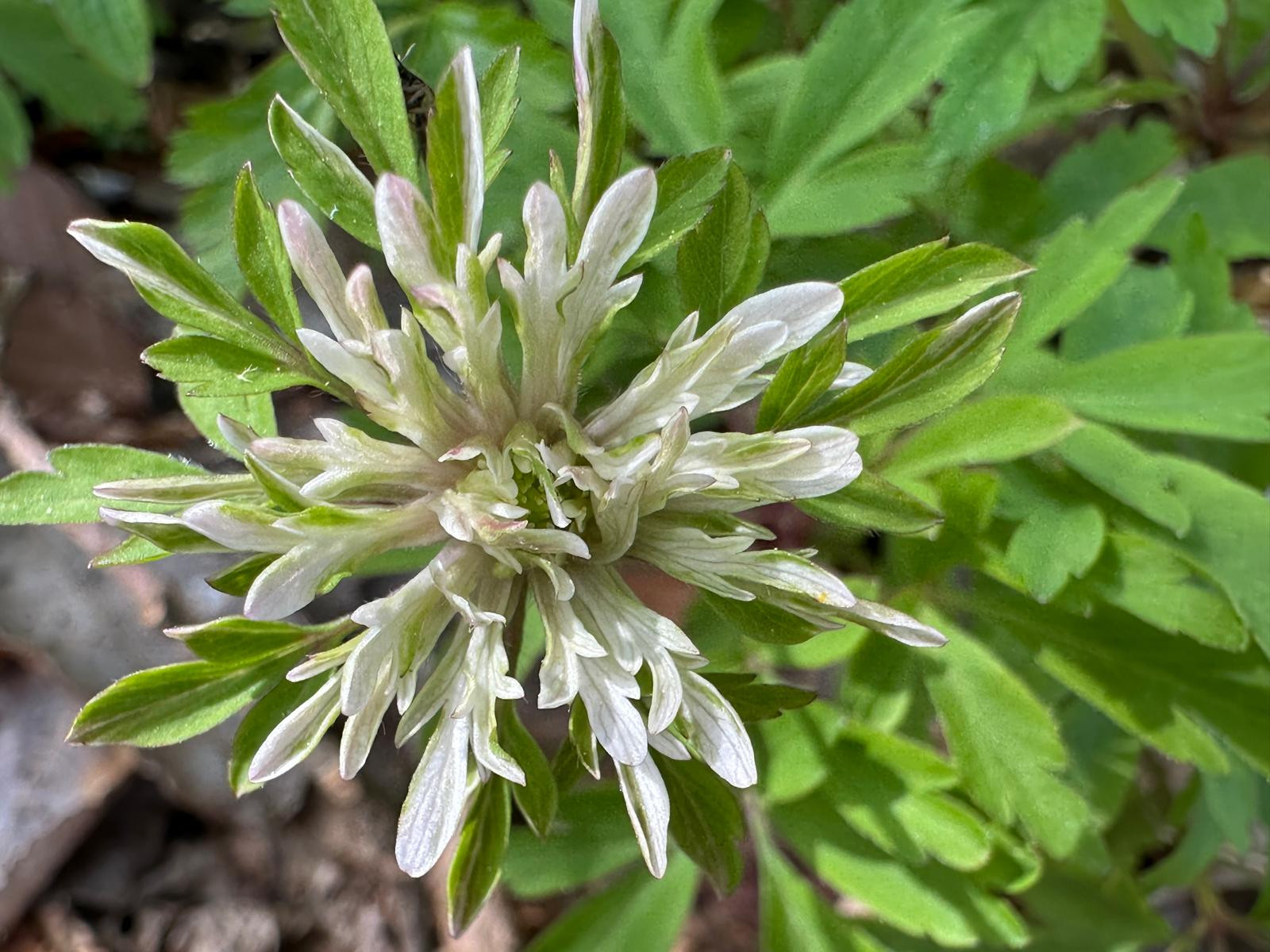 Sucht man per Bildsuche nach "Anemone nemorosa 'Bracteata Pleniflora' " und klickt dann das entsprechende Vorschaubildchen an (aber ohne, die Seite zu besuchen), sieht man ein etwas größeres Vorschaubild, wo diese Ausformung gut zu erkennen ist.