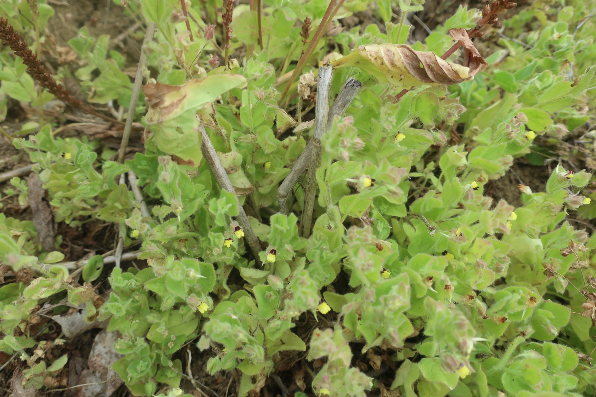 Kickxia spuria auf dem gleichen Acker wie letztes Jahr: Waldrand bei Klosterlangheim, MTB 5832-43. Möglicherweise im Vertrags-Naturschutz, zwischen sehr wenig Roggen und höheren Pflanzen wie Cirsium arvense, Dipsacus fullonum und Daucus carota sind immer wieder Lücken fürs Tännelkraut. Vermutlich wird in Kürze gemäht, dann kann es sich noch mehr ausbreiten.
