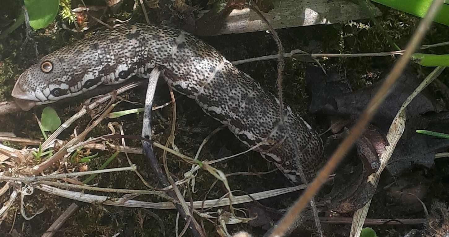 Eine Riesenraupe des Nachtkerzenschwärmers, vor ein paar Tagen im Vorgarten (das "Auge" ist hinten):