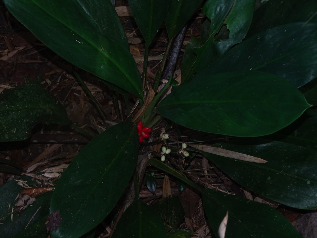 6. Aglaonema nitidum (Jack) Kunth Description : Medium to large, somewhat robust, pachycaul or decumbent, evergreen herb, to 2 m tall. Stem erect or with lower part reclining on ground in larger plants, 0.5–5 cm thick. Leaves several to rather many together, usually restricted to the terminal portion of stems in larger plants; petioles deeply channelled, (8–)11–26(–29) cm long; petiolar sheath extending to the petiole tip, margins scarious; leaf blade narrowly elliptic to narrowly oblong or oblanceolate, 11–50 by 4–20 cm, base cuneate to attenuate, rarely broadly acute, apex acuminate to broadly acute or shortly acuminate, apiculate, coriaceous, usually plain green, sometimes with grey variegation either in bars following the venation or in rather irregularly scattered blotches; venation barely or not differentiated in fresh and dry material but sometimes primary veins weakly differentiated into 5–9 or more. Inflorescences 2–5 together; peduncle 5–21 cm long, equalling or surpassing the subtending petiole; spathe oblong, 3–8.5 cm, decurrent for 4–20 mm, white at anthesis, becoming green during fruiting, persistent until fruit full-sized but still green, then marcescent; spadix cylindrical, equalling or slightly exceeding spathe, 1.3–7 cm, stipitate; stipe 0.2–0.9 cm long; pistillate flower zone (0.2–)0.5–1 cm long with 16–37 flowers; staminate flower zone 1.1–6 by ca.1.5 cm, white. Fruits ellipsoid, green, changing to white then pink and finally red.