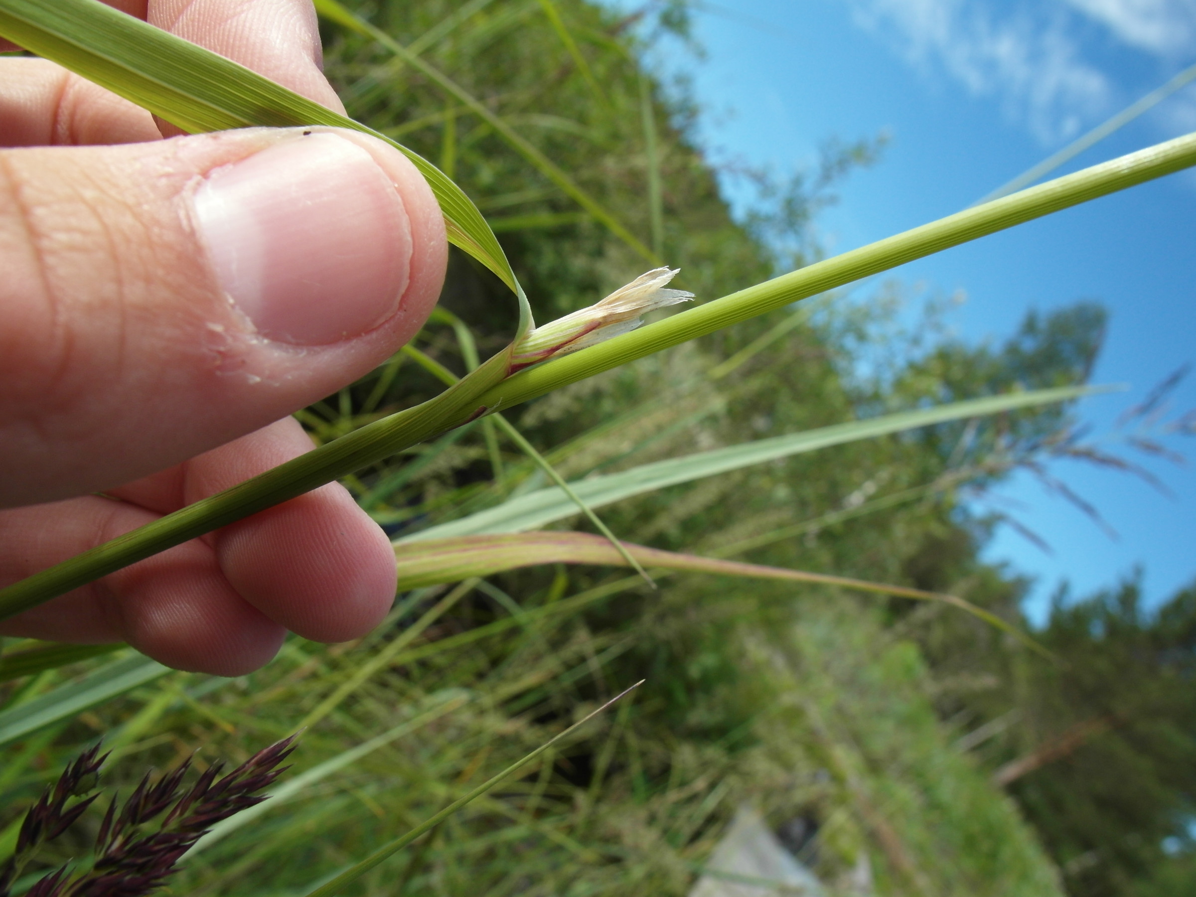 Das Gras war zwischen 1m und 1,50 m hoch, allein die Blütenrispe schätze ich auf 25 - 30 cm. Die Ährchen hatten jeweils nur eine Blüte mit einer auffallend weißen Narbe (Bild 5). Die Blätter waren lang und sehr schmal, weniger als 1 cm. Sie waren beiderseits rauh.