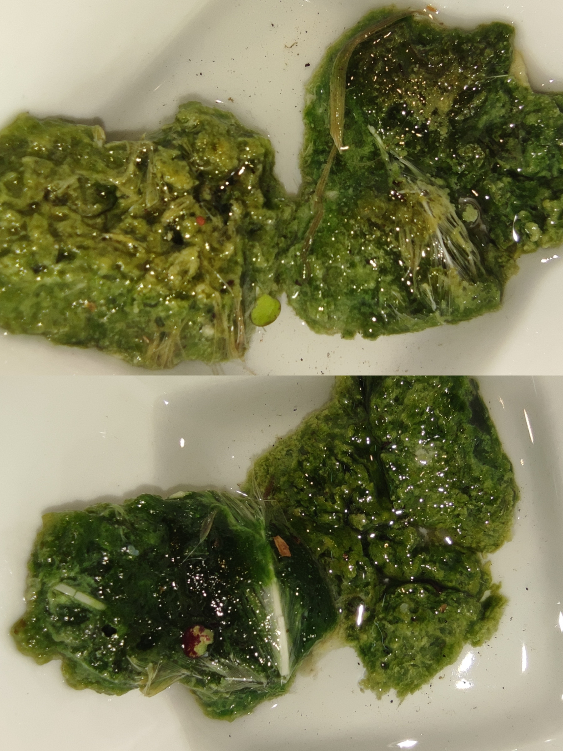 Konsistenz, fast wie Gummi, leicht schonzig und kein definiertes Oben und Unten (bestenfalls durch die intensivere Grünfärbung ein "oben" erkennbar