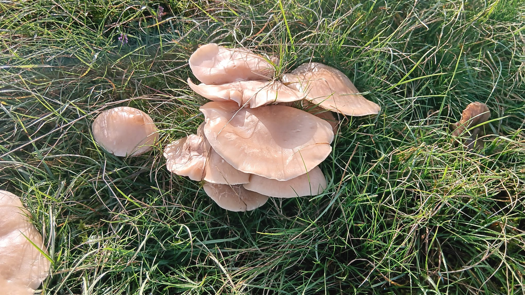 Zufällig war ich heute auf einer Wiese und sah auch ein paar Pilze, z.B. größere Ellerlinge (vermutlich Cuphophyllus colemannianus).