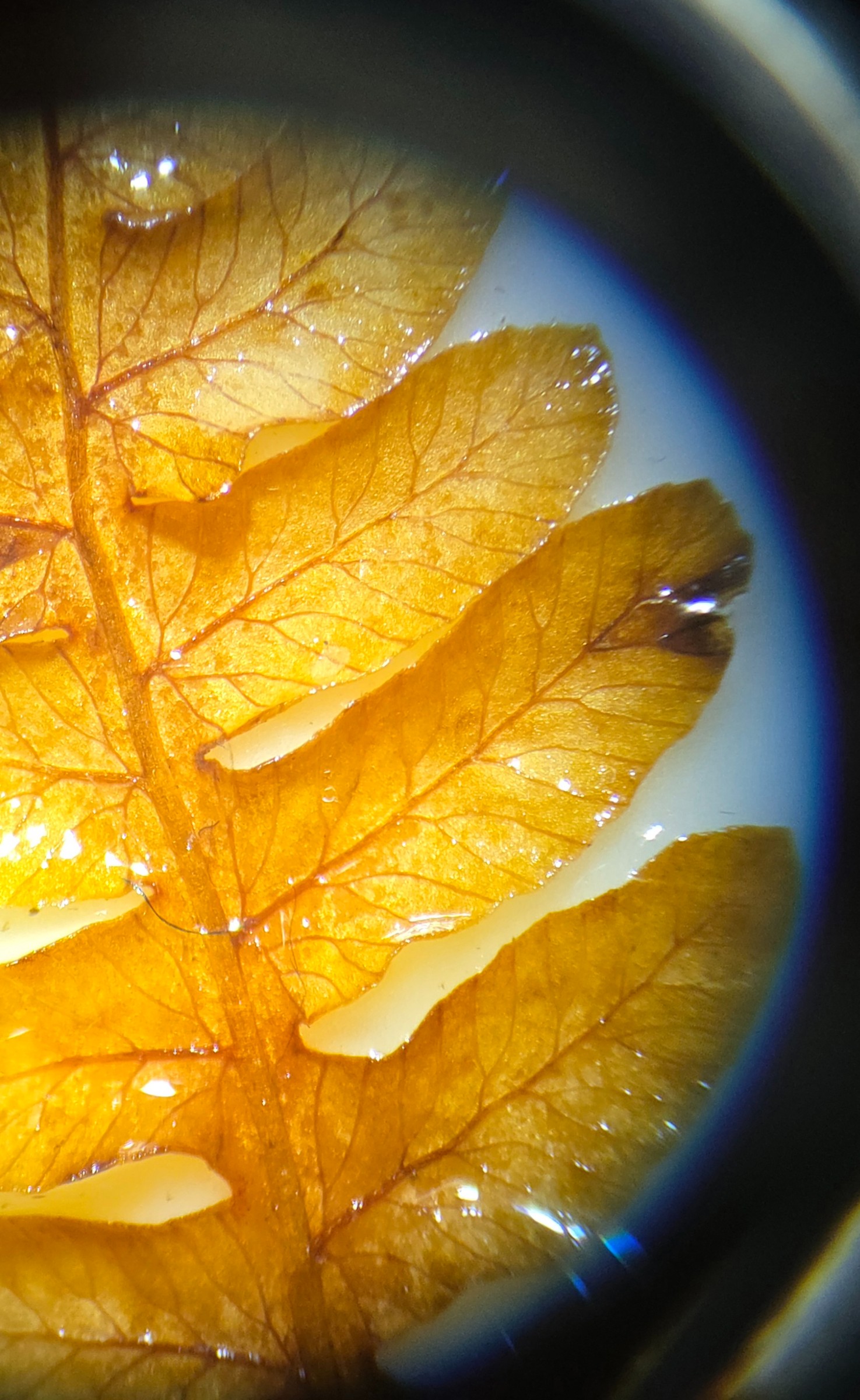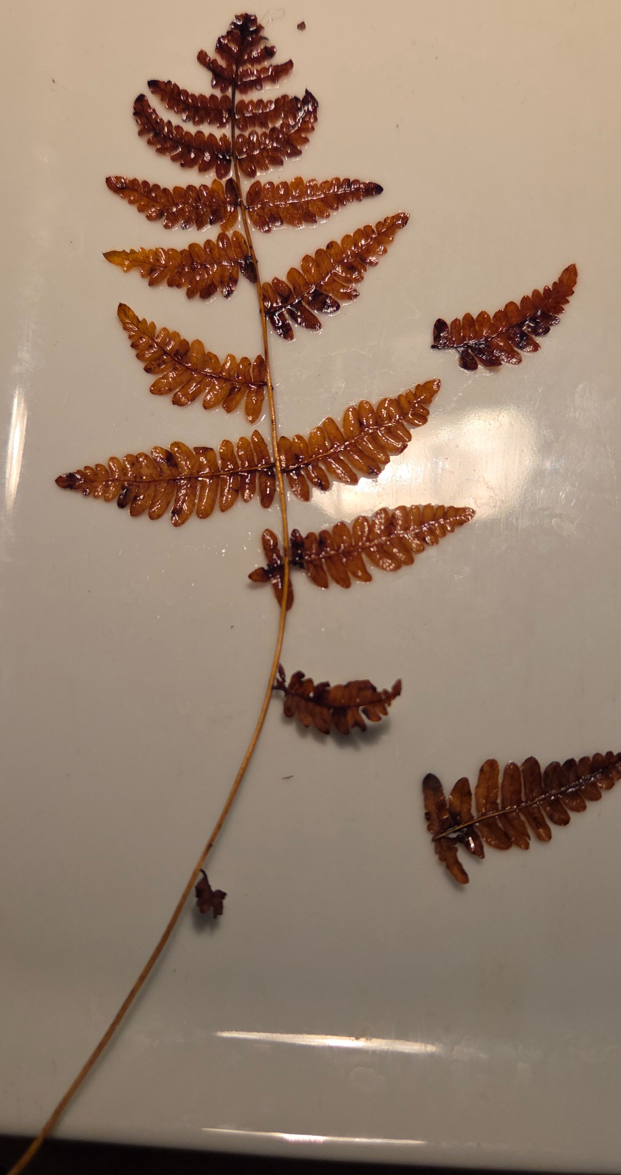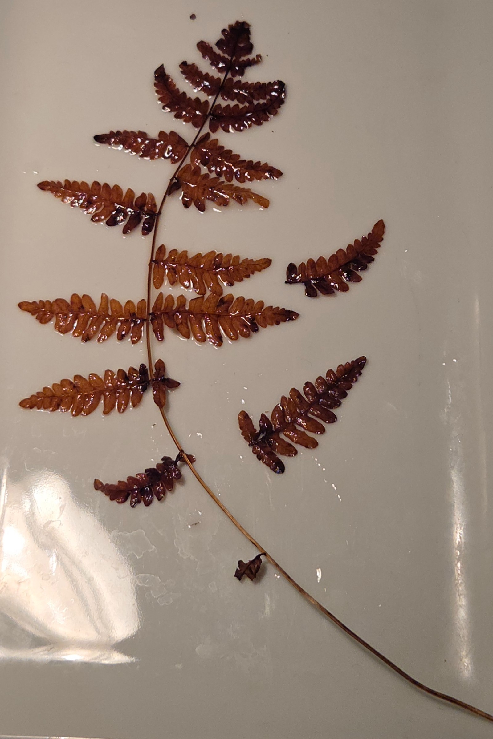 Ein längerer Wedel, ca 30 cm, braun vertrocknet zusammengerollt und in Wasser entfaltet, keine Sporangien leider, die an den Mittelrippen stark zusammengewachsen Fiedern 2. Ordnung sehen aus wie bei Thelypteris.