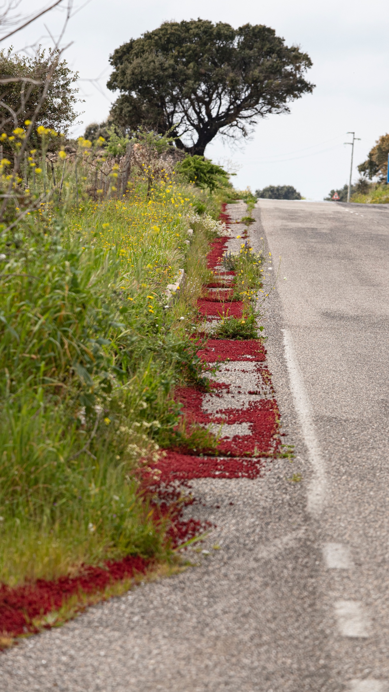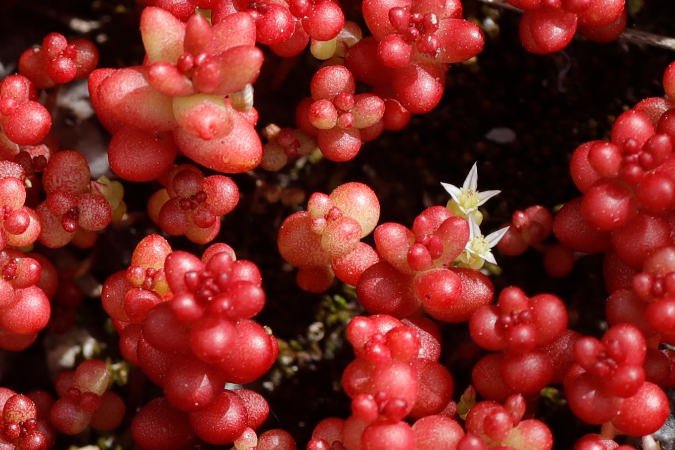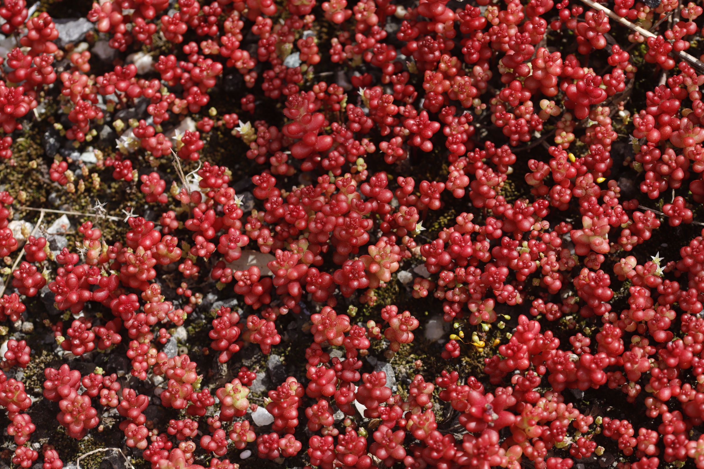diesen Mauerpfeffer habe ich Anfang April 2025 auf Sardinien fotografiert. Auf dem Ausschnitt sieht man Blüten mit 4 Kronblättern. Auf der Mittelmeerflora finde ich keine passende Pflanze, oder gehören die Blüten gar nicht zu den roten Blättern?