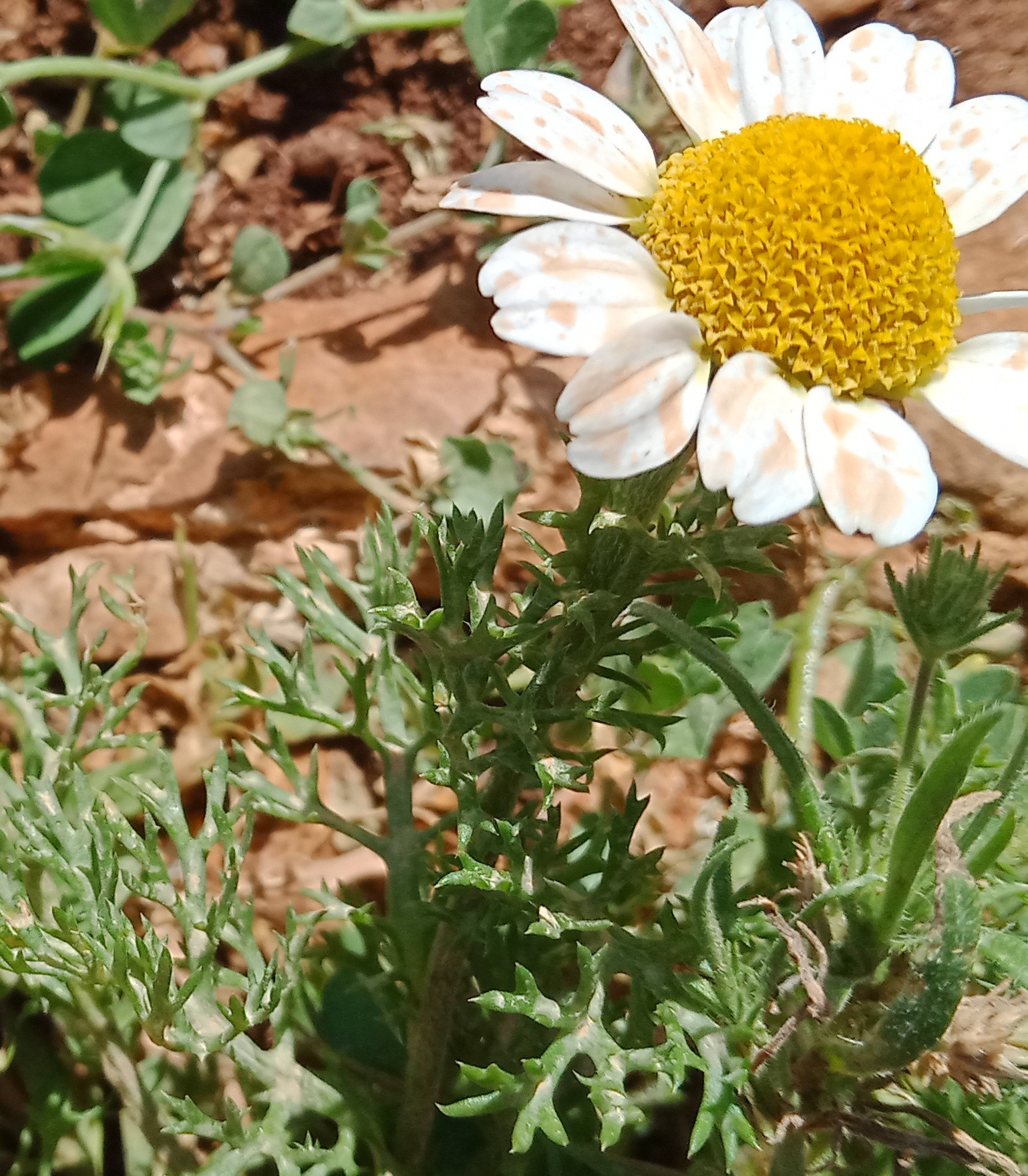 Das müsste eigentlich (aber nur mit cf.) Anthemis chia sein. Dummerweise hast Du mal wieder die relevanten Merkmale, nämlich das voll entwickelte Blütenköpfchen von unten, nicht photographiert. Außerdem bräuchte man die Spreuschuppen für endgültige Bestätigung.
