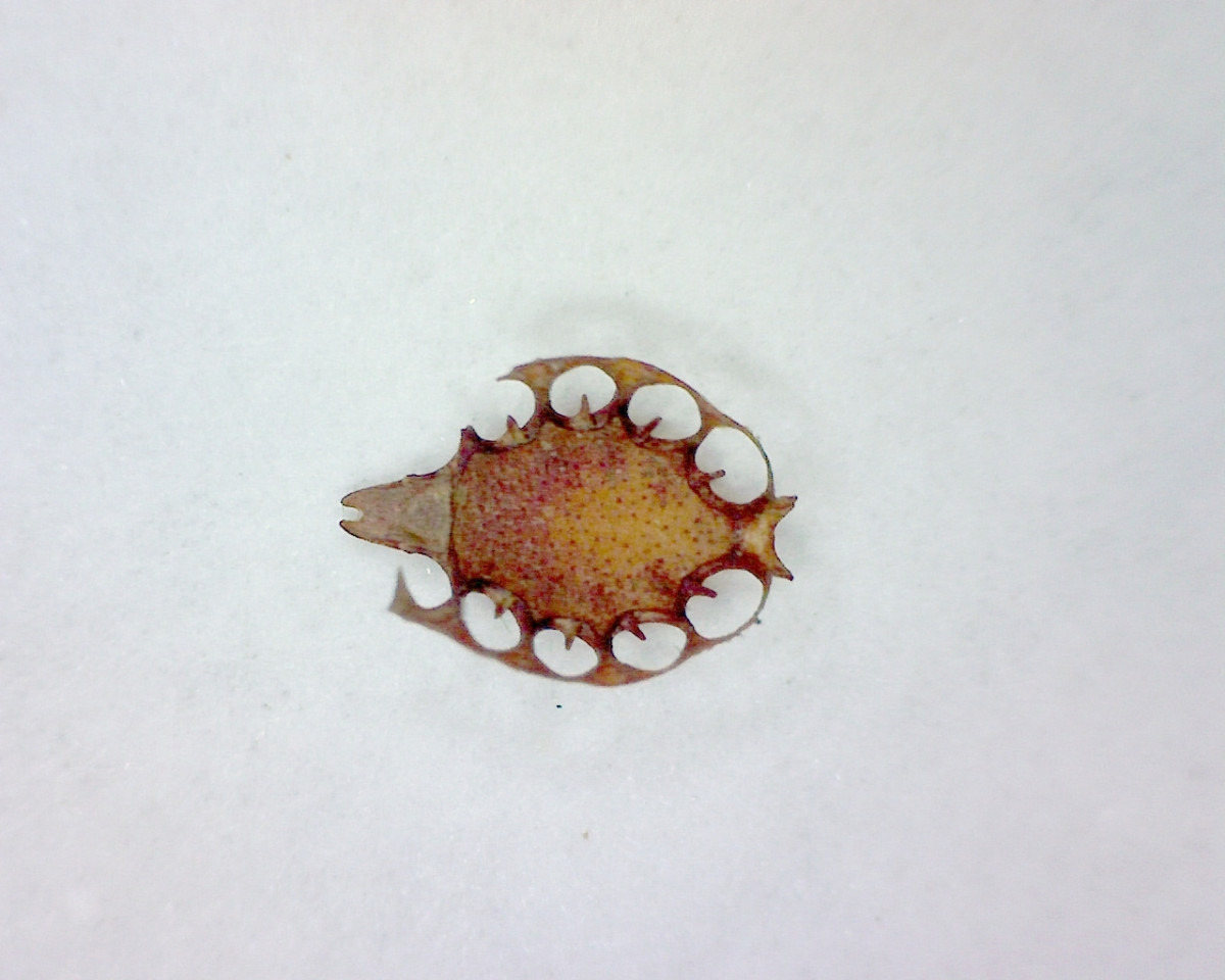 Hallo Dieter, meine Vermutung ist auch was Tierisches. Vielleicht ein Vertreter der Spinnentiere, wo nur noch das Kopfbruststück übrig ist ...